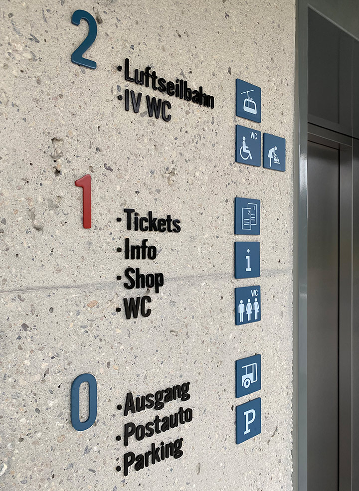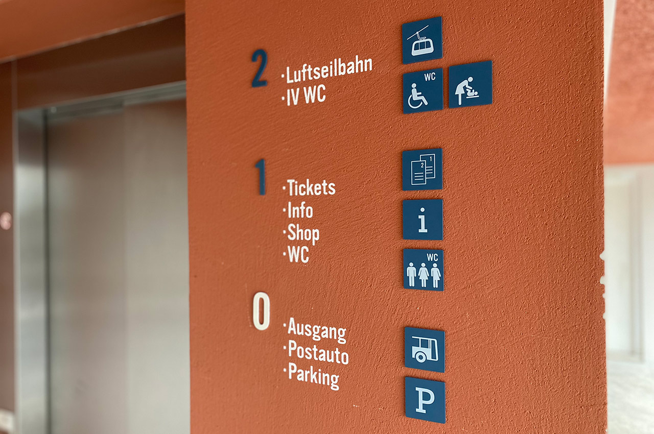 Die neu konzipierte und gestaltete Signaletik bietet Orientierungshilfen zur Gebäudeidentifikation, zur generellen Nutzungsübersicht und zur Richtungsweisung. So kann das «Erlebnis Brienzer Rothorn» von Luzerner Seite aus bequem erschlossen werden, sei es zum Wandern, Freeriden oder zum «Käfele» im neuen Biosphären-Restaurant.